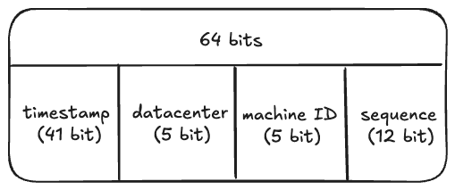 64비트를 timestamp / datacenter / machine ID / sequence로 나눠서 생성하는 방식이다. 분산 환경에서 각 서버가 독립적인 ID 생성을 할 수 있다는 장점이 있다. 또한 timestamp가 반영되므로 시간순 정렬이 가능하다.